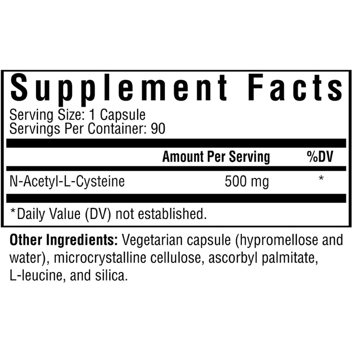 Provides 500 mg of N-acetyl-L-cysteine (NAC) per vegetarian capsule.